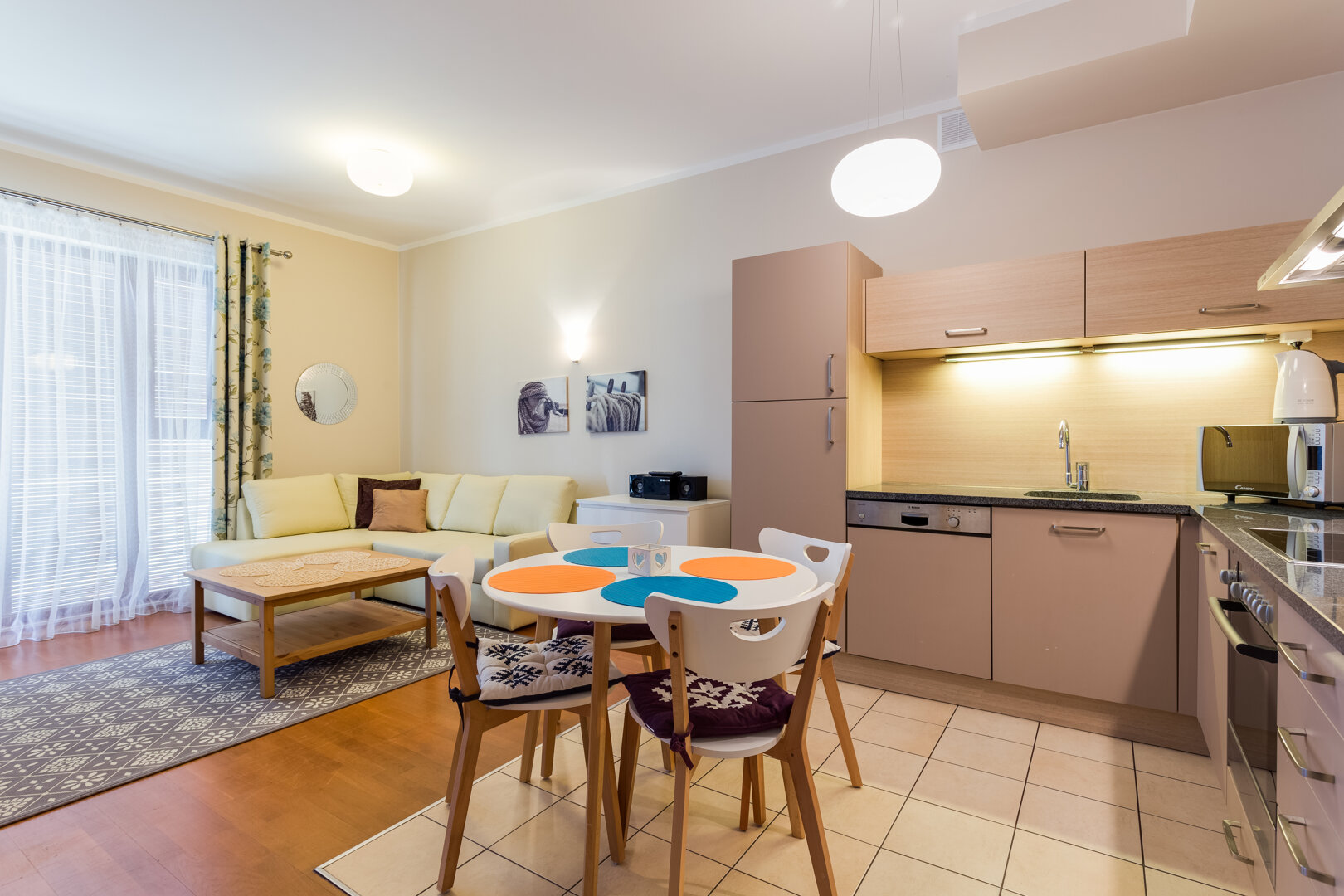 Ein ideales Apartment für eine vierköpfige Familie, gelegen an der Düne zwischen der Promenade und dem Strand im Komplex Baltic Park Plaza. Das Gebäude liegt nur 100 Meter vom Strand und der lebhaften Promenade mit vielen Restaurants, Geschäften und Cafés