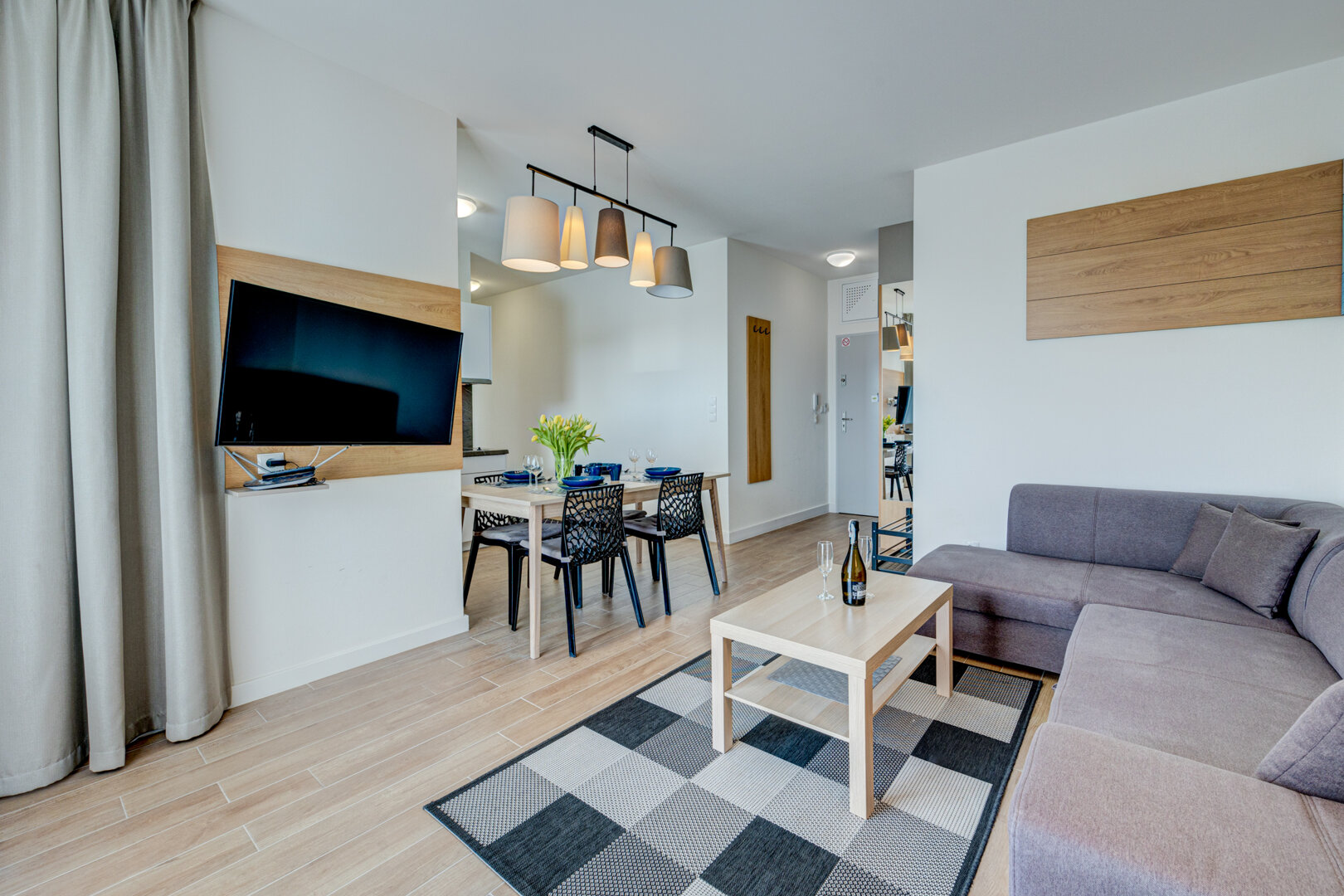Eine komfortable Zweizimmerwohnung, komplett ausgestattet, die hervorragende Bedingungen zum Entspannen für 4 Personen bietet. Es befindet sich im Erdgescoss des Baltic Waves Resort-Komplexes, etwa 400 m vom Strand entfernt.