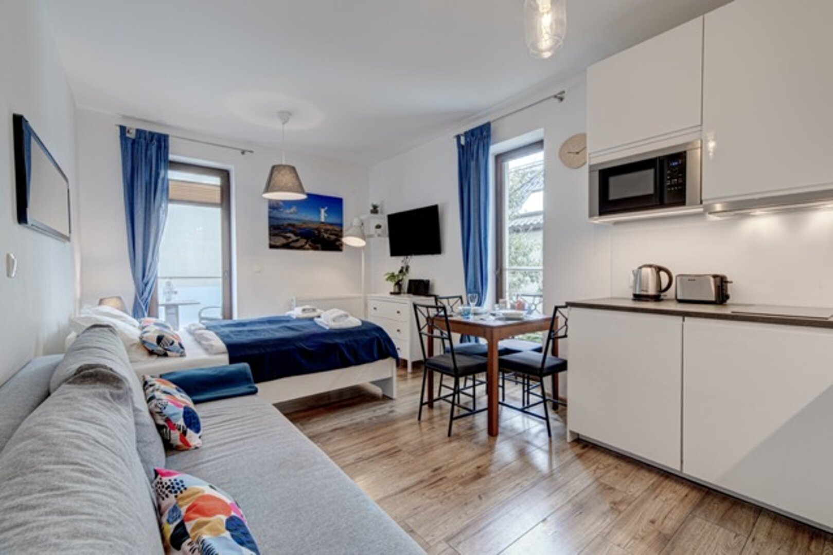 Neues, komfortables Ein-Zimmer-Apartment mit Balkon mit Blick auf den Hafen , Bad und Küchenzeile im Zentrum von Swinemünde.