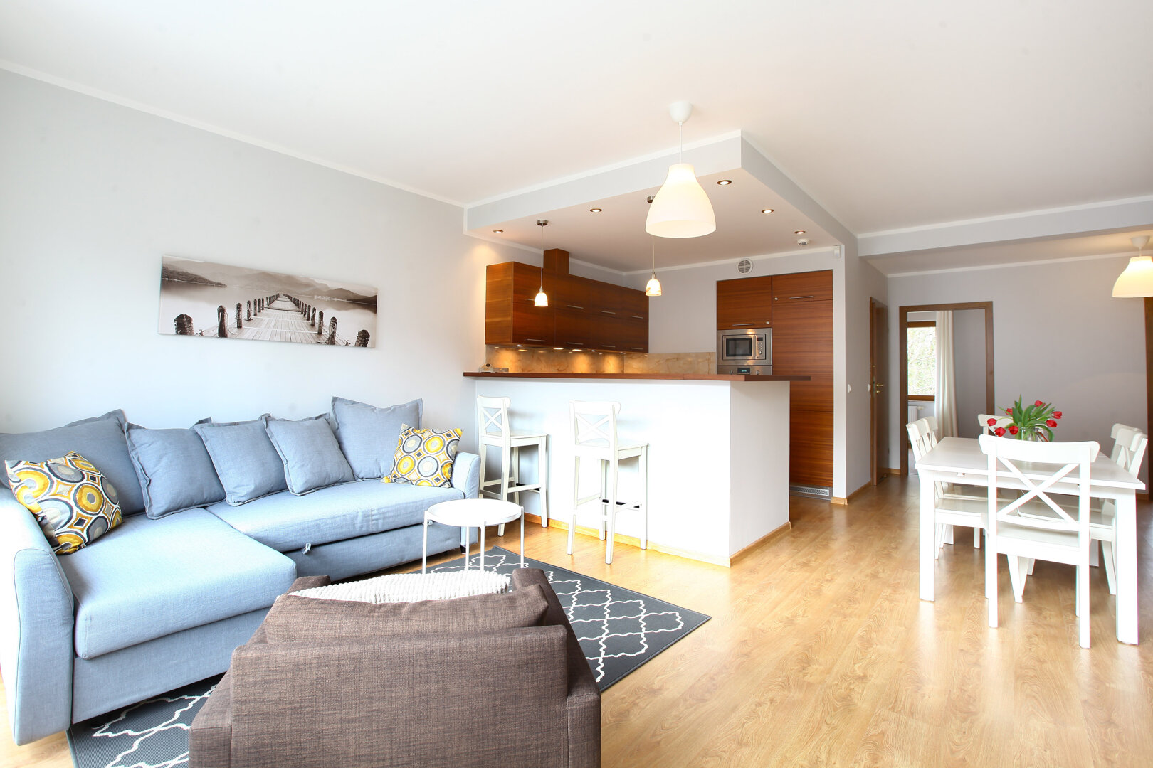 Eine voll ausgestattete Küchenzeile, ein komfortabel eingerichtetes Badezimmer mit Badewanne und Waschmaschine, 2 unabhängige Schlafzimmer mit 2-Personen-Betten, ein geräumiges Wohnzimmer mit Schlafsofa und ein sonniger Balkon bieten den Komfort dieser Wohnung. Die Gäste können terrestrisches digitales Fernsehen und drahtloses Internet nutzen. Ein zusätzlicher Vorteil des Angebots ist die hervorragende Lage – die Anlage befindet sich in einer ruhigen grünen Ecke. Ein idealer Ort für lange Spaziergänge und Radtouren.