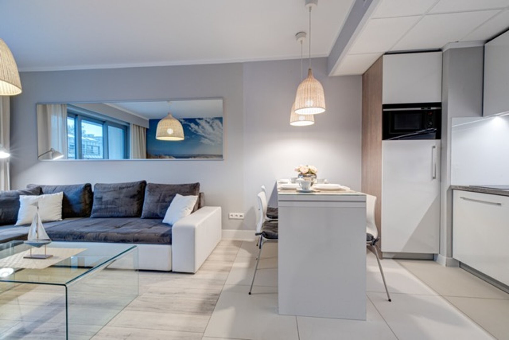 Die Wohnung besteht aus einem Wohnzimmer (großes Ecksofa), das mit einer Küchenzeile verbunden ist, einem Schlafzimmer mit einem bequemen Bett und einem geräumigen, hellen Badezimmer. Der große Vorteil ist die Unabhängigkeit beider Räume (separater Eingang vom Flur zum Wohnzimmer und zum Schlafzimmer). Die Wohnung ist mit 2 Flachbildfernsehern (im Wohnzimmer und im Schlafzimmer) und WLAN-Internetzugang ausgestattet. Perfekt für eine vierköpfige Familie. Im Gebäude gibt es einen Außenpool (saisonal geöffnet) mit Blick auf das Meer und die Seebrücke im obersten Stockwerk des Gebäudes, eine Sauna und eine Sonnenterrasse.