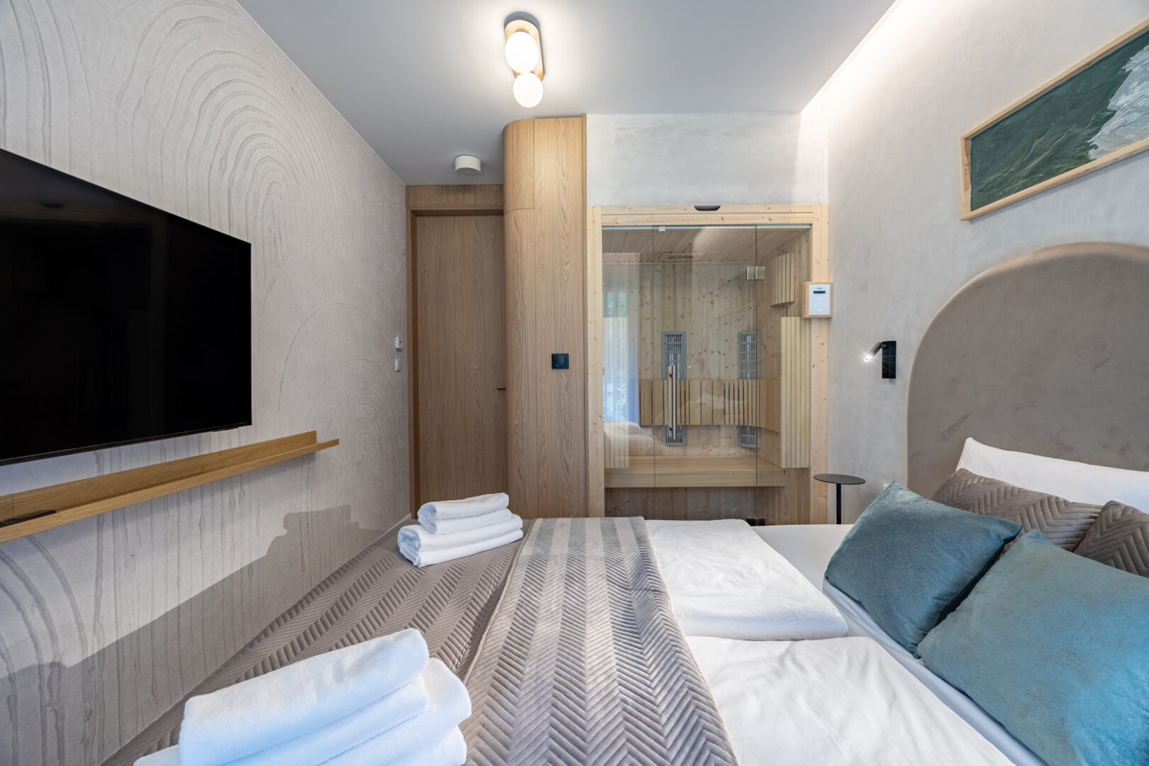 Diese komfortable, moderne und voll ausgestattete Wohnung bietet den perfekten Rahmen für einen Familienurlaub. Sie besteht aus einem Wohnzimmer mit angeschlossener voll ausgestatteter Küche (Geschirrspüler, Kühlschrank, Backofen, Elektroherd, Wasserkocher, Toaster, Kaffeemaschine etc.), einem Schlafzimmer und einem Badezimmer. Ein großer Vorteil dieser Wohnung ist die private Sauna im Schlafzimmer. Zur Wohnung gehört außerdem eine charmante, grüne Terrasse.