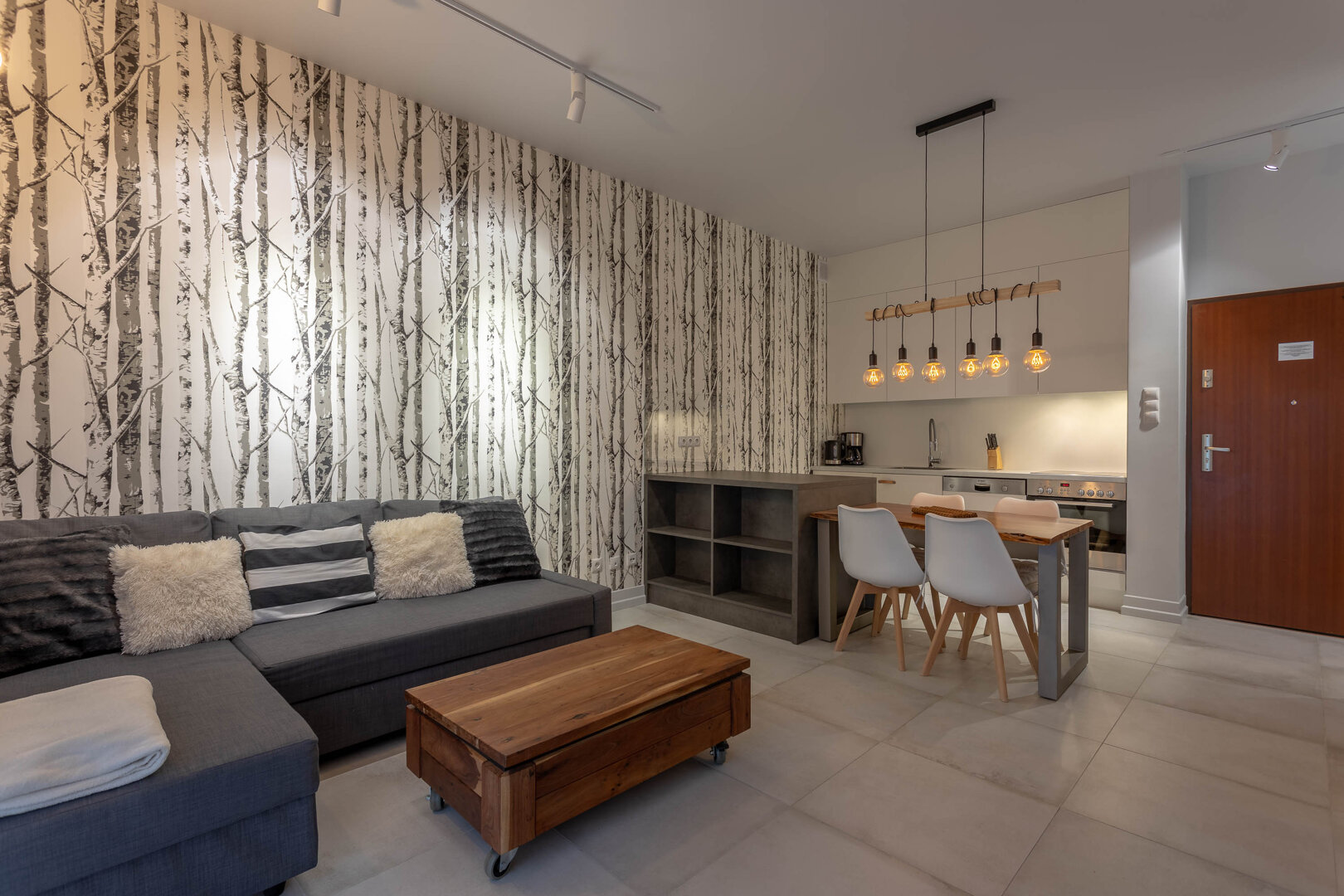 A two-room apartment consists of a living room, a bedroom, a kitchen and a bathroom. The kitchenette is equipped with, among others with a dishwasher, oven, electric hob, fridge-freezer, electric kettle, dishes.