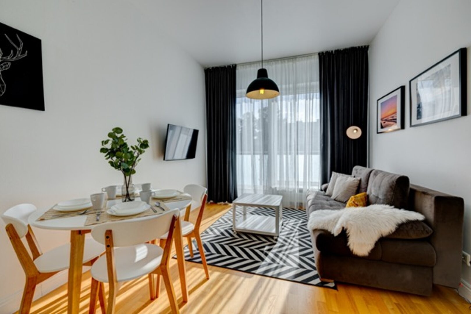 A luxurious, sunny apartment with a beautiful view of greenery , located on the third floor, in the Aquamarina apartment complex. The complex is located in the forest, on the seafront, right next to the beach. Aquamarina is a unique place for everyone looking for peace and quiet, away from the city center.