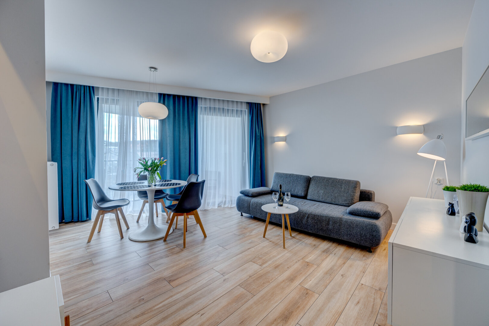 Cozy, two-room apartment consists of an independent bedroom with a comfortable bed for two people, a comfortable living room with a kitchenette, a spacious bathroom with a shower and a balcony. A large fold-out sofa with a sleeping function in the living room provides a comfortable sleep for two people. Comprehensive equipment of the apartment with comfortable furniture, TV and wireless Internet access will certainly allow you to have a good rest. The apartment includes a ground parking space. The building has a 24/7 security, grocery and clothing store. In the neighborhood there is a restaurant called “Kredens” serving excellent cuisine.