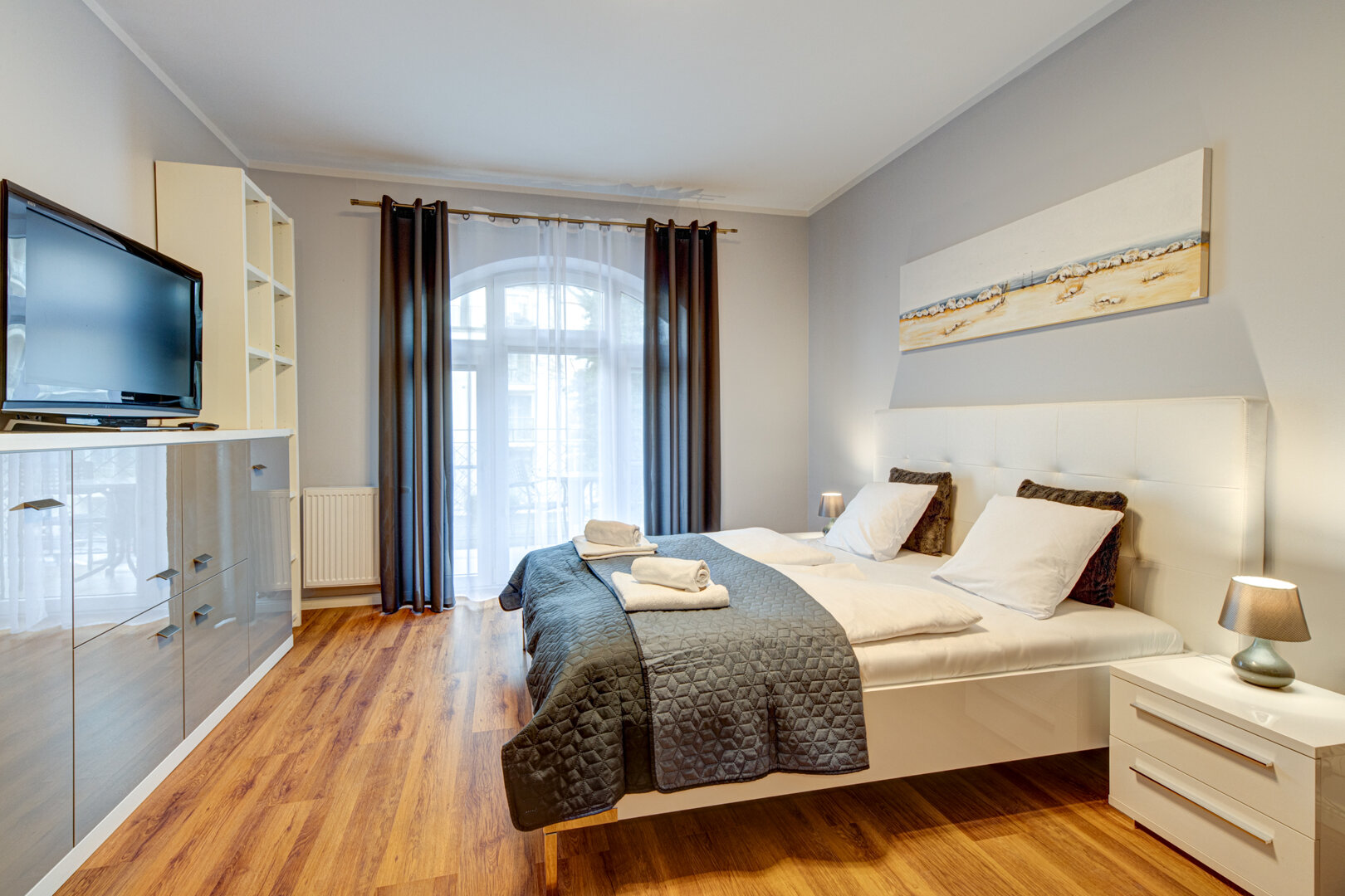 A fully equipped kitchenette, a comfortably furnished bathroom with a shower, a living room with a comfortable 2-person bed and an extra bed for a third person (a comfortable ‘smart’ bed hidden in the chest of drawers) and a sunny balcony are the comfort of this apartment. There is a TV and internet available for guests. An additional advantage of the offer is its excellent location – the facility is located on the promenade, where there are many restaurants, boutiques and cafes.