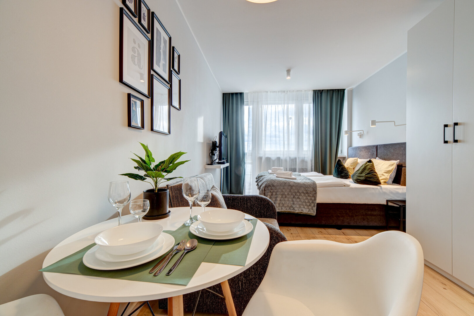 A new, comfortable, one-room apartment with a spacious bathroom and a kitchenette, located in the center of Świnoujście, in a new apartment building.