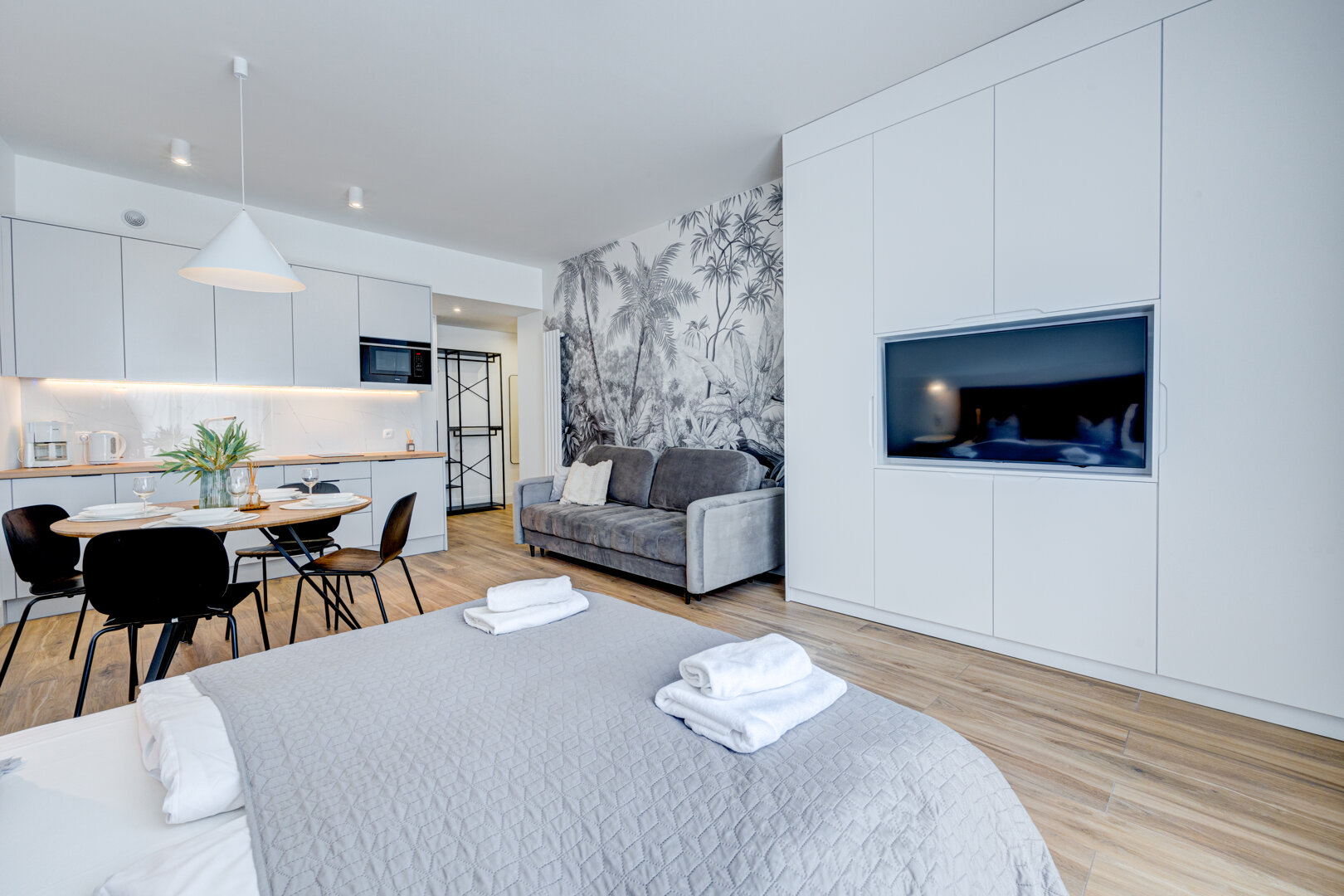 A new, comfortable, one-room apartment with a spacious bathroom and a kitchenette, located in the center of Świnoujście, in a new apartment building.