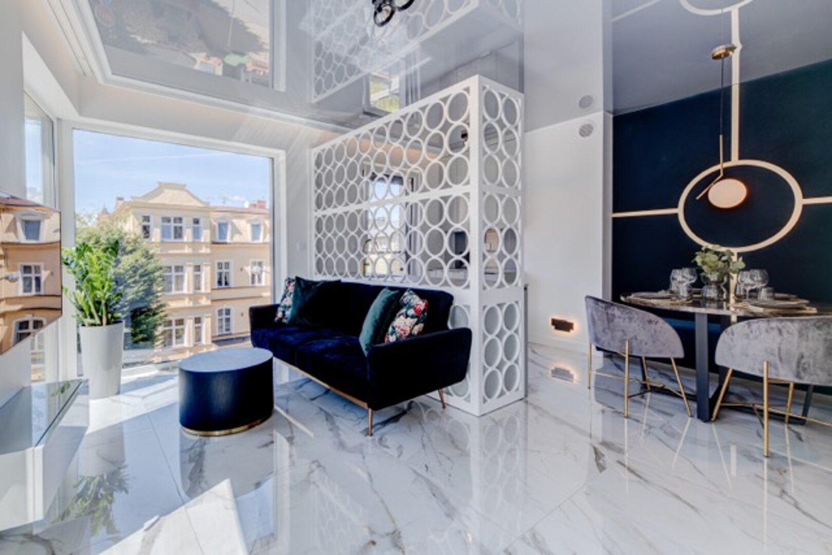 It is a 3-room apartment located on the first floor. The seating area is connected with the dining room and the kitchenette.