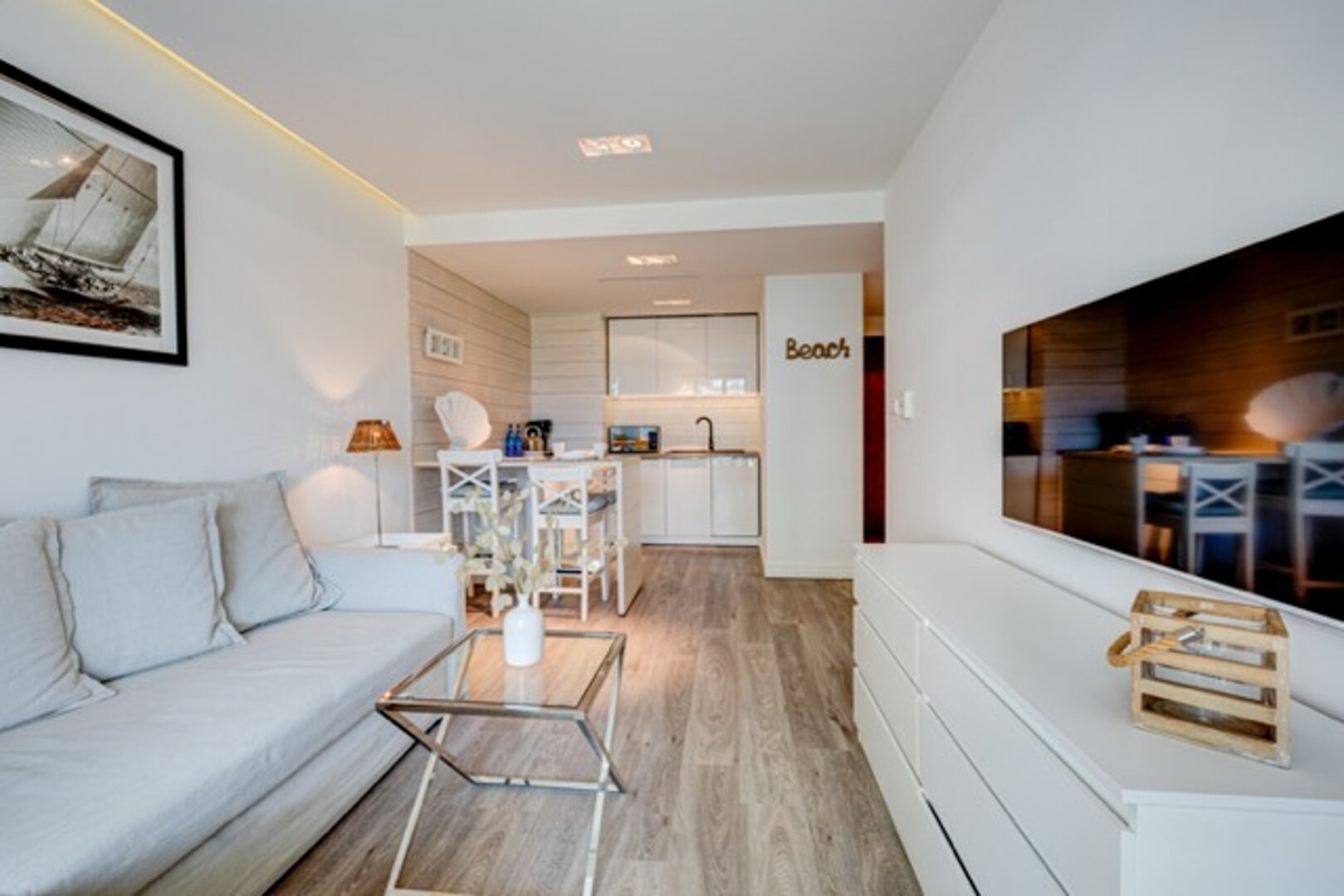 The apartment consists of a living room (large sofa bed) connected to a kitchenette, a bedroom with a comfortable bed and a spacious, bright bathroom. The big advantage is the independence of both rooms (separate entrance from the corridor to the living room and to the bedroom). The apartment is equipped with 2 flat-screen TV and wireless Internet access. Perfect for a family of three. In the building, there is an outdoor swimming pool (open seasonally) with a view of the sea and the pier on the top floor of the building, a sauna and a sun terrace.