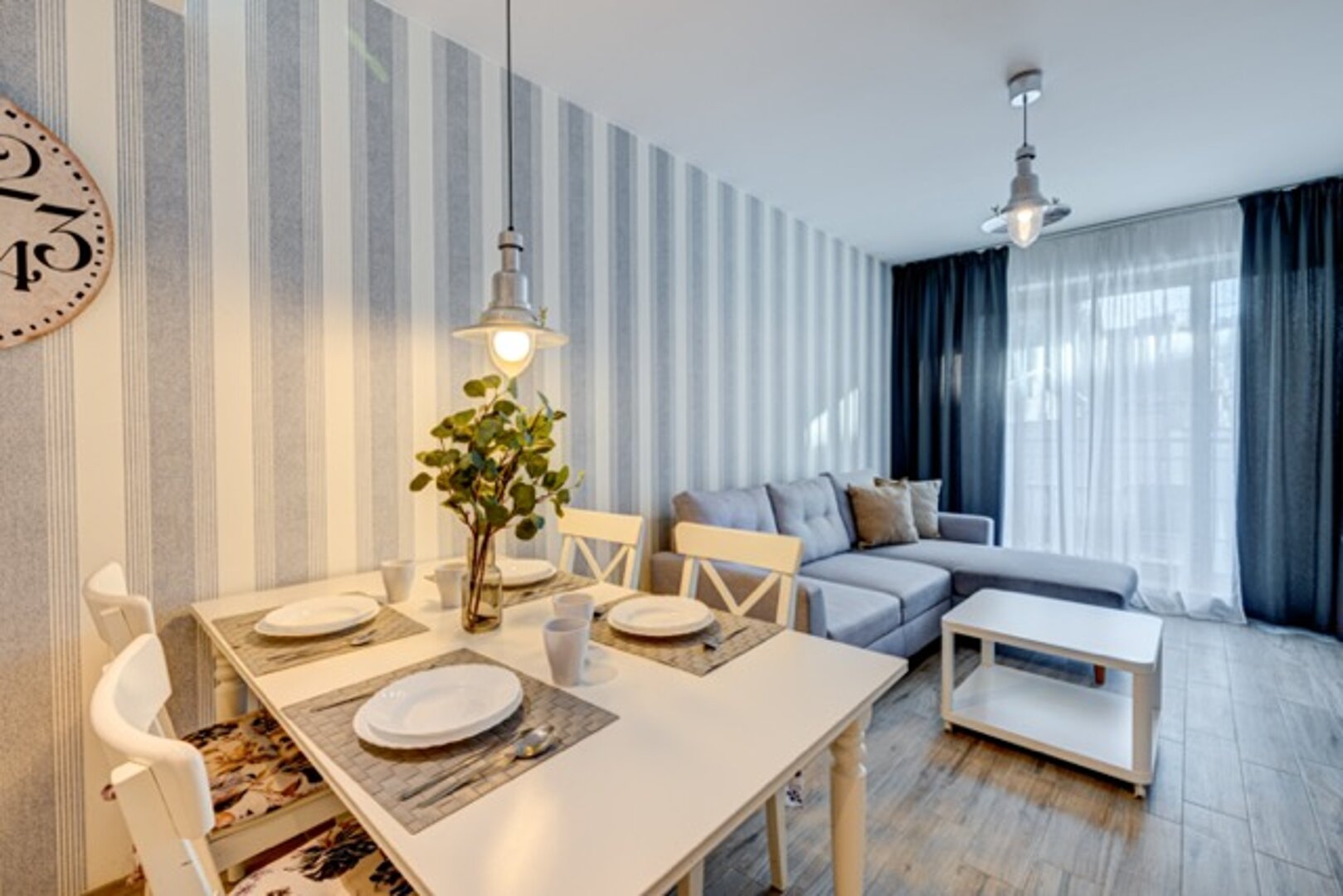 The apartment is located in the Aquamarina apartment complex. The complex is located in the forest, on the seafront, right next to the beach. Aquamarina is a unique place for everyone looking for peace and quiet, away from the city center.
