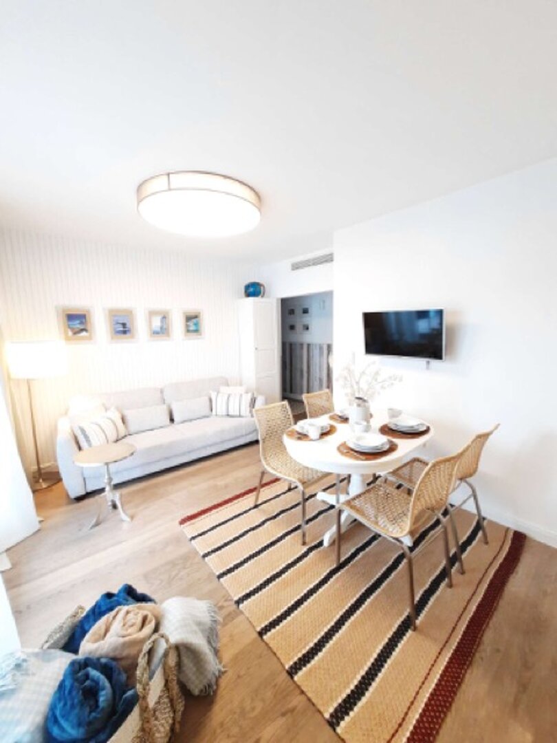 Apartment on the ground floor with terrace, ideal for 2-3 people, situated approx. 300 meters from the beach. It is located in the modern Marea apartment building (building with an elevator). In the near distance, the promenade and the pier with cafes and