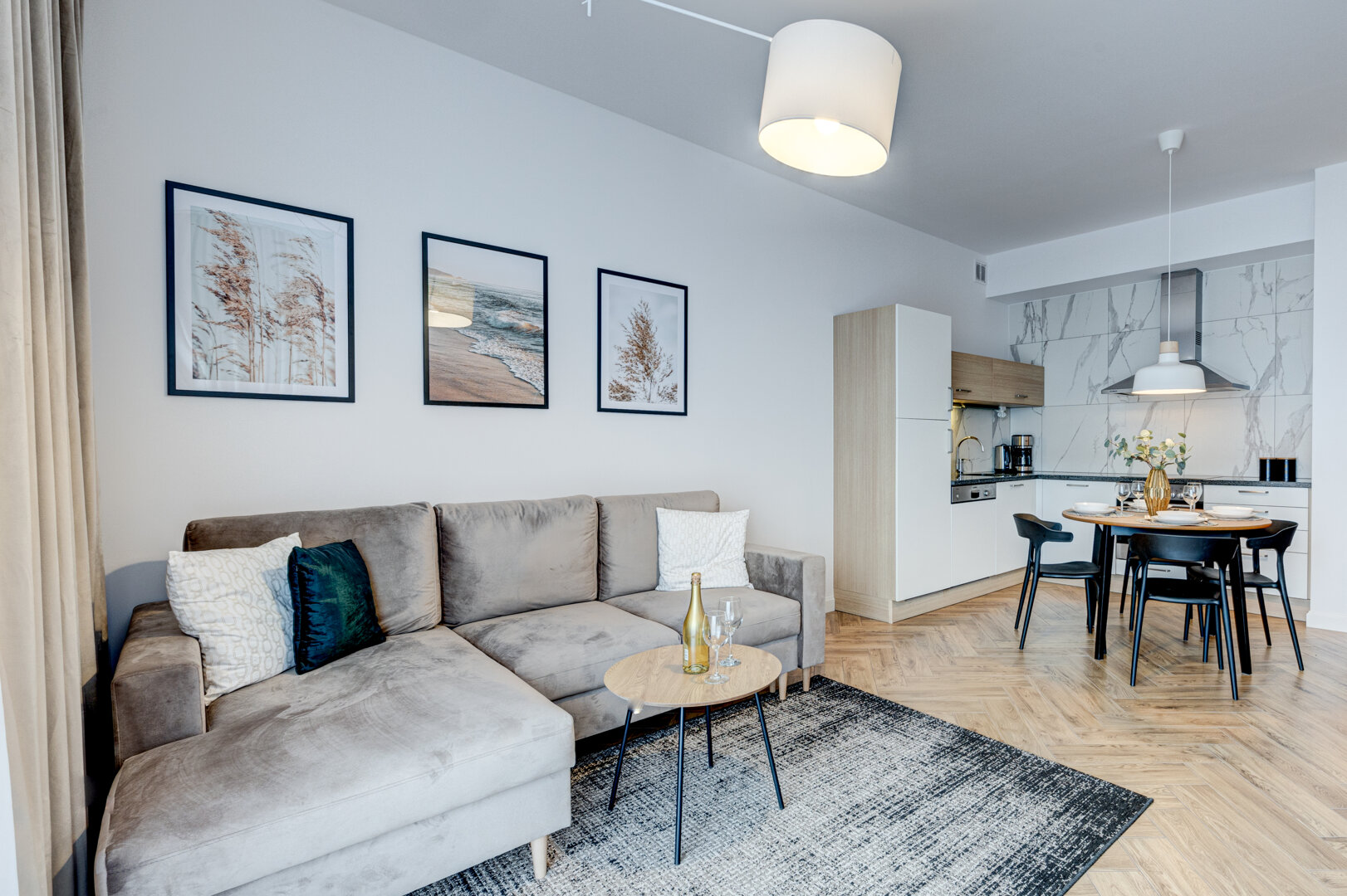 Przytulny apartament zlokalizowany w kompleksie Baltic Park Plaża, na wydmie pomiędzy promenadą a plażą.