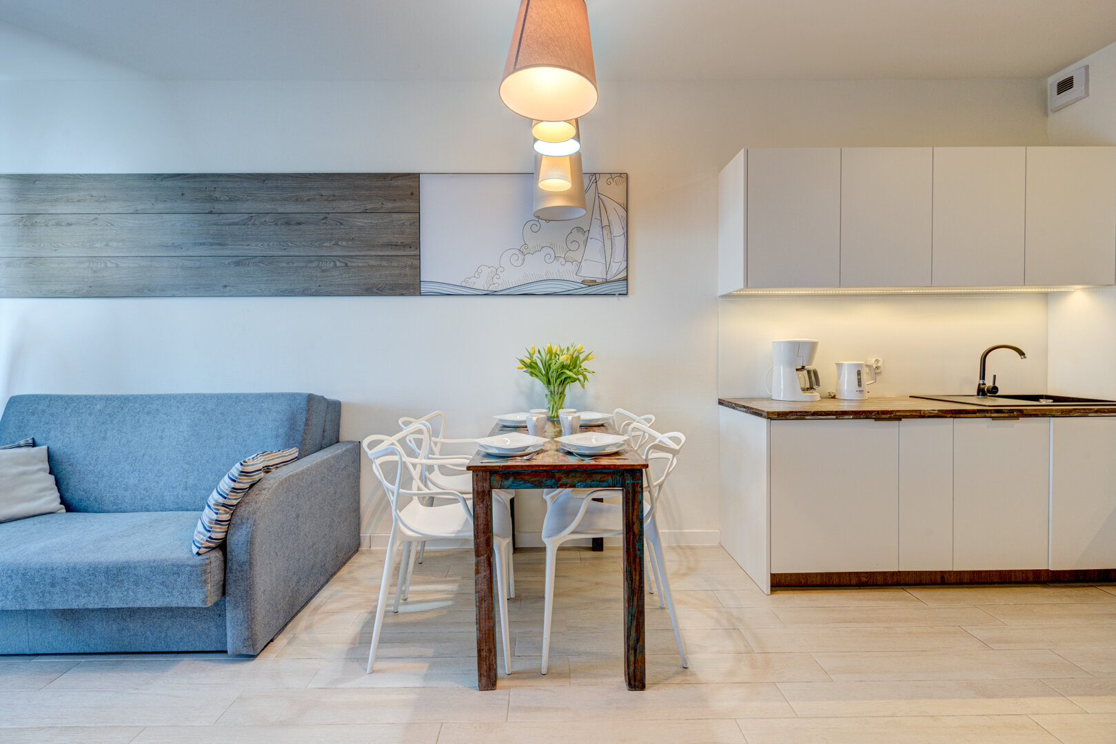Komfortowy dwupokojowy apartament, kompleksowo wyposażony, zapewniający znakomite warunki do wypoczynku dla 4 osób. Usytuowany jest na wysokim parterze w kompleksie Baltic Waves Resort, położonym ok. 400 m od plaży.