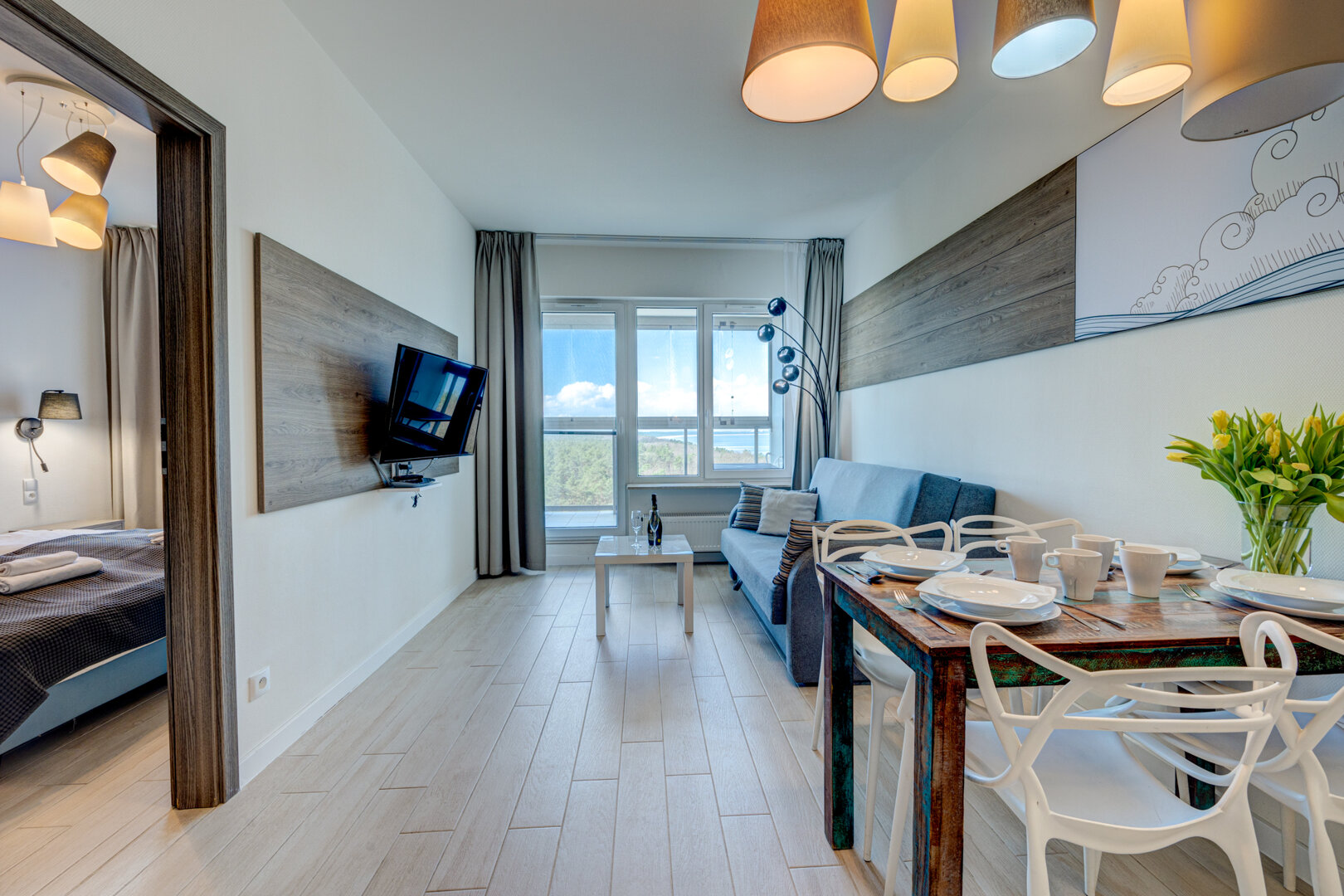 Komfortowy dwupokojowy apartament, kompleksowo wyposażony, zapewniający znakomite warunki do wypoczynku dla 4 osób. Usytuowany jest na wysokim parterze w kompleksie Baltic Waves Resort, położonym ok. 400 m od plaży.
