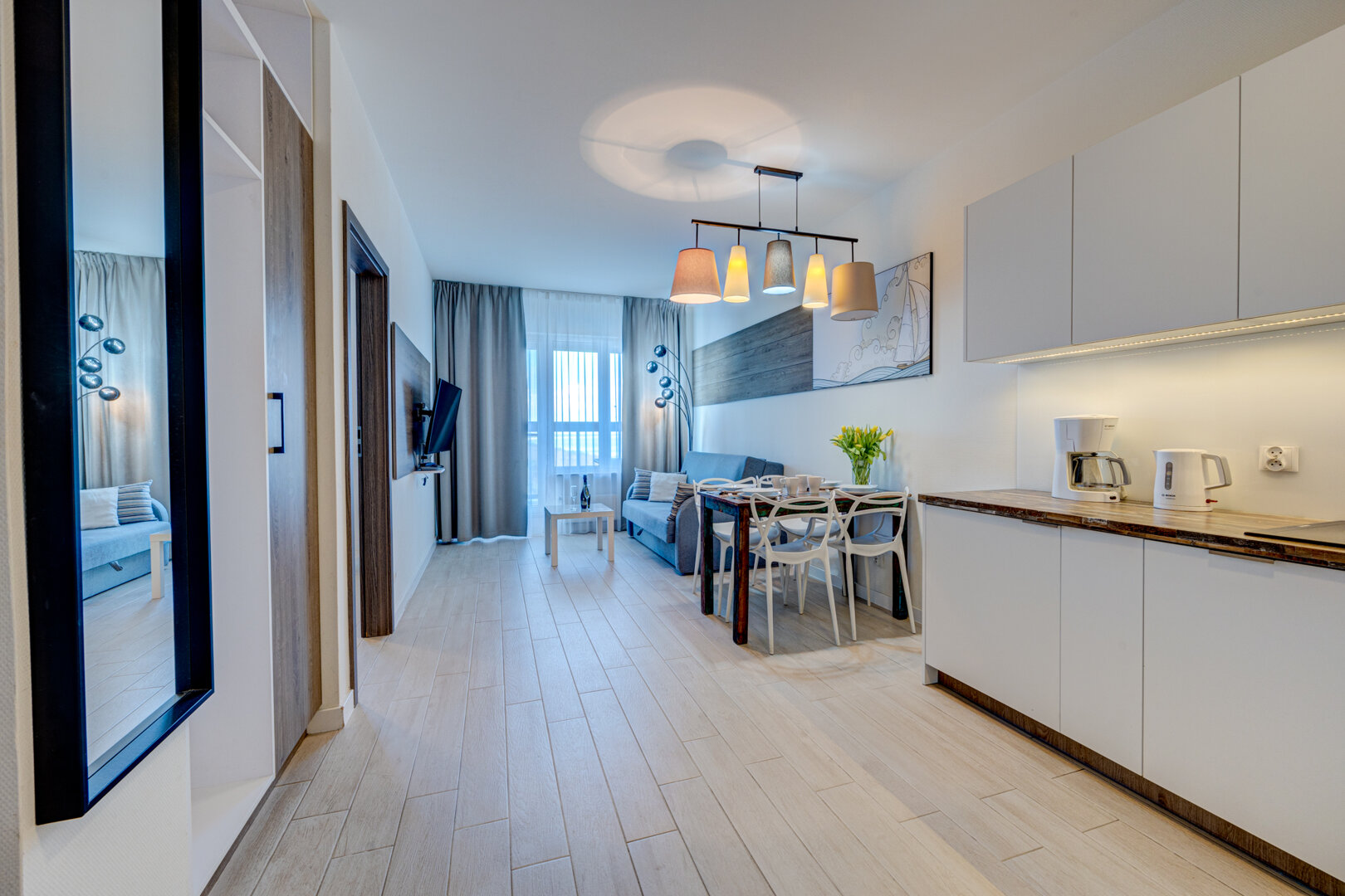 Komfortowy dwupokojowy apartament, kompleksowo wyposażony, zapewniający znakomite warunki do wypoczynku dla 4 osób. Usytuowany jest na pierwszym piętrze w kompleksie Baltic Waves Resort, położonym ok. 400 m od plaży.