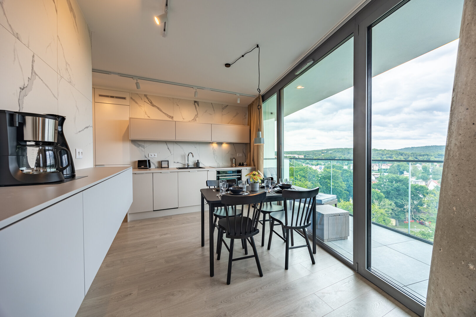 Luksusowy apartament z widokiem na nadmorski las sosnowy położony jest na czwartym piętrze, w kompleksie apartamentowym Aquamarina Onyx. Kompleks zlokalizowany jest w lesie, w pierwszej linii brzegowej, tuż przy plaży. Aquamarina to wyjątkowe miejsce dla